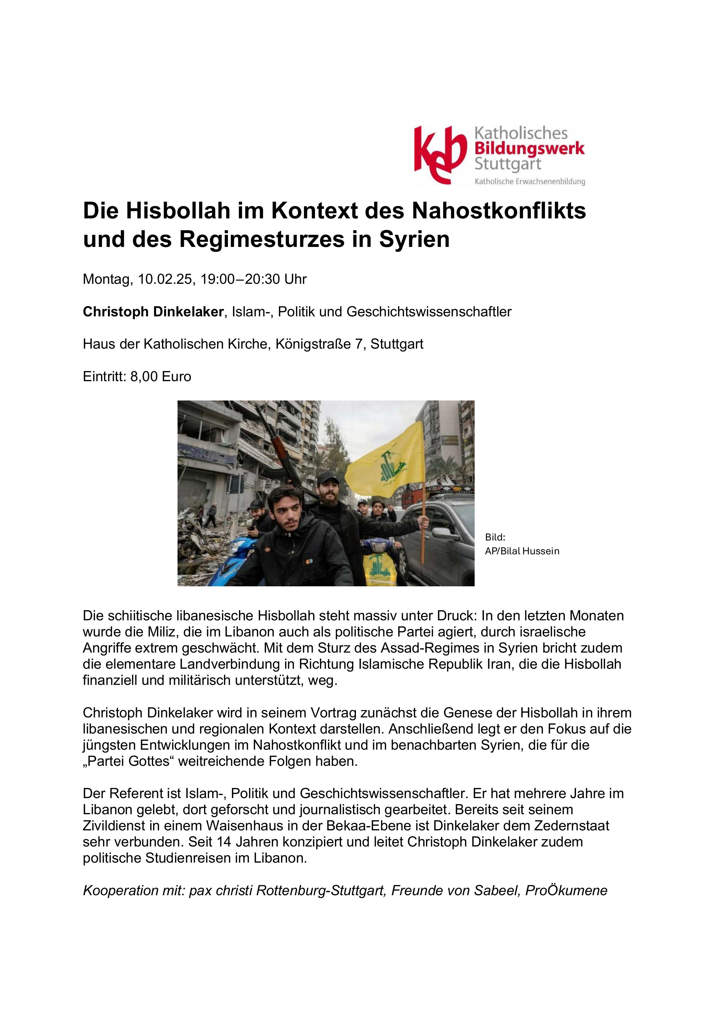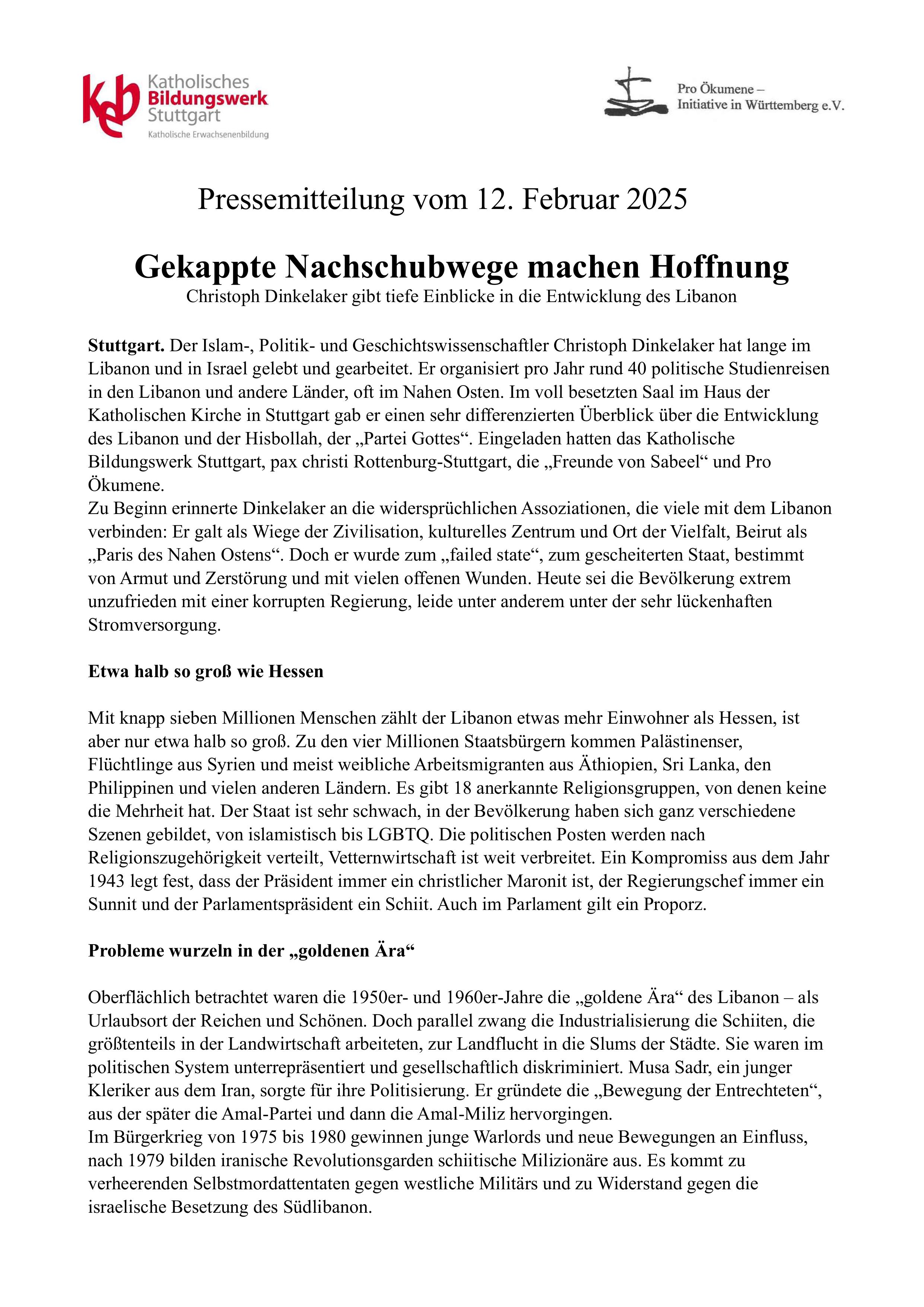 - Mittwoch, 24. September 2025, 19.00-20.30 Uhr: "Sehnsucht nach Frieden - eine Stimme aus Palästina" mit Faten Mukarker