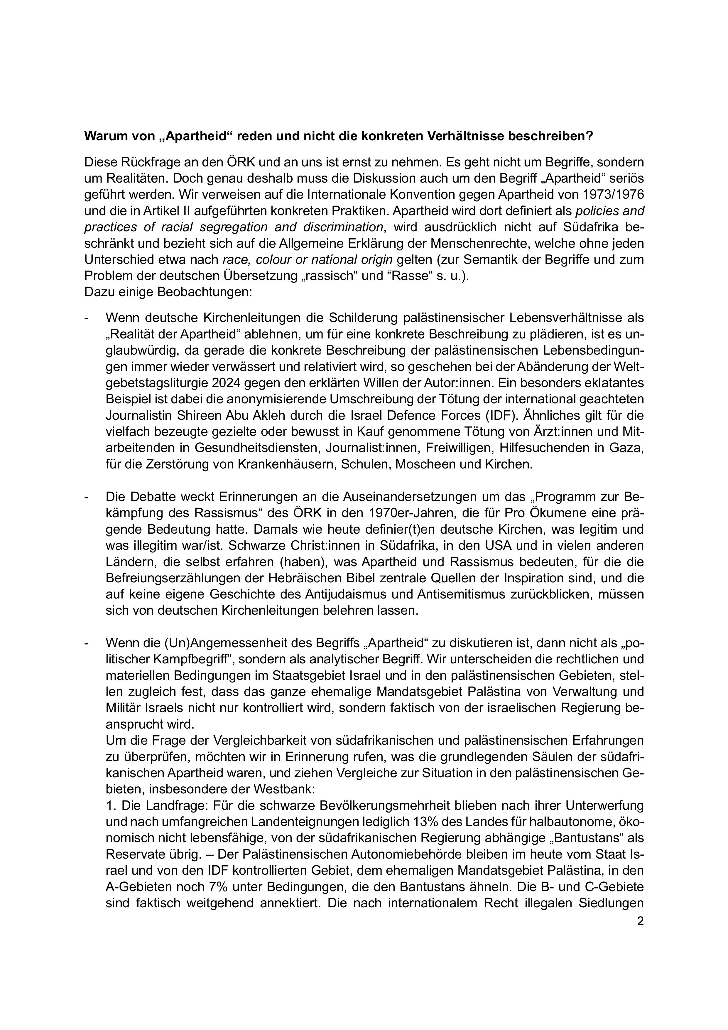 Straflosigkeit, z. B. von gewalttätigen Siedlern, zu, wirft der ÖRK-Erklärung aber fehlende Empathie mit Jüdinnen und Juden vor und kritisiert insbesondere die Verwendung des Begriffs Apartheid im Hinblick auf Israel als einen