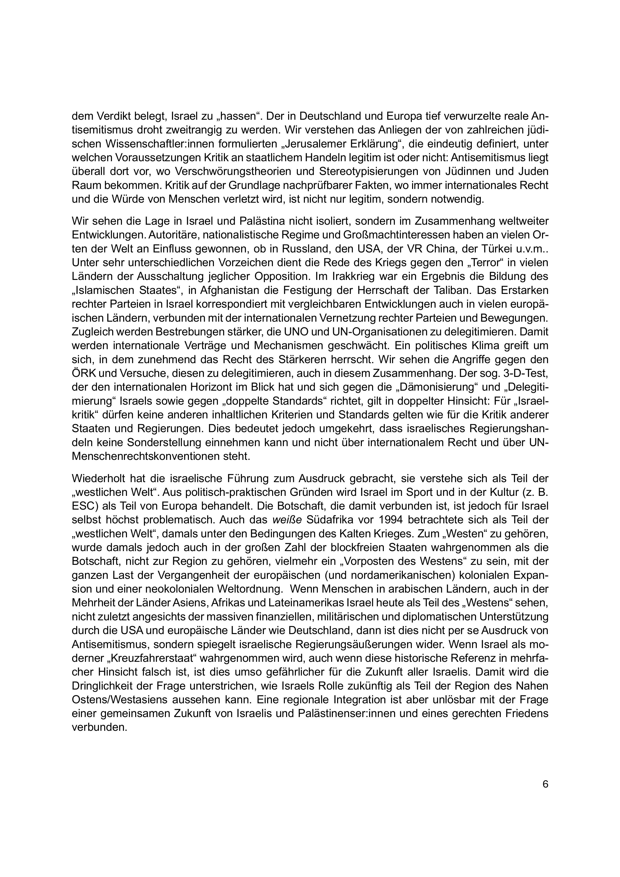 Staat Israel dieselben Regeln gelten müssen wie für alle anderen Staaten. Diese Position wird auch von vielen jüdischen Wissenschaftler:innen, Journalist:innen und Friedensaktivist:innen vetreten.