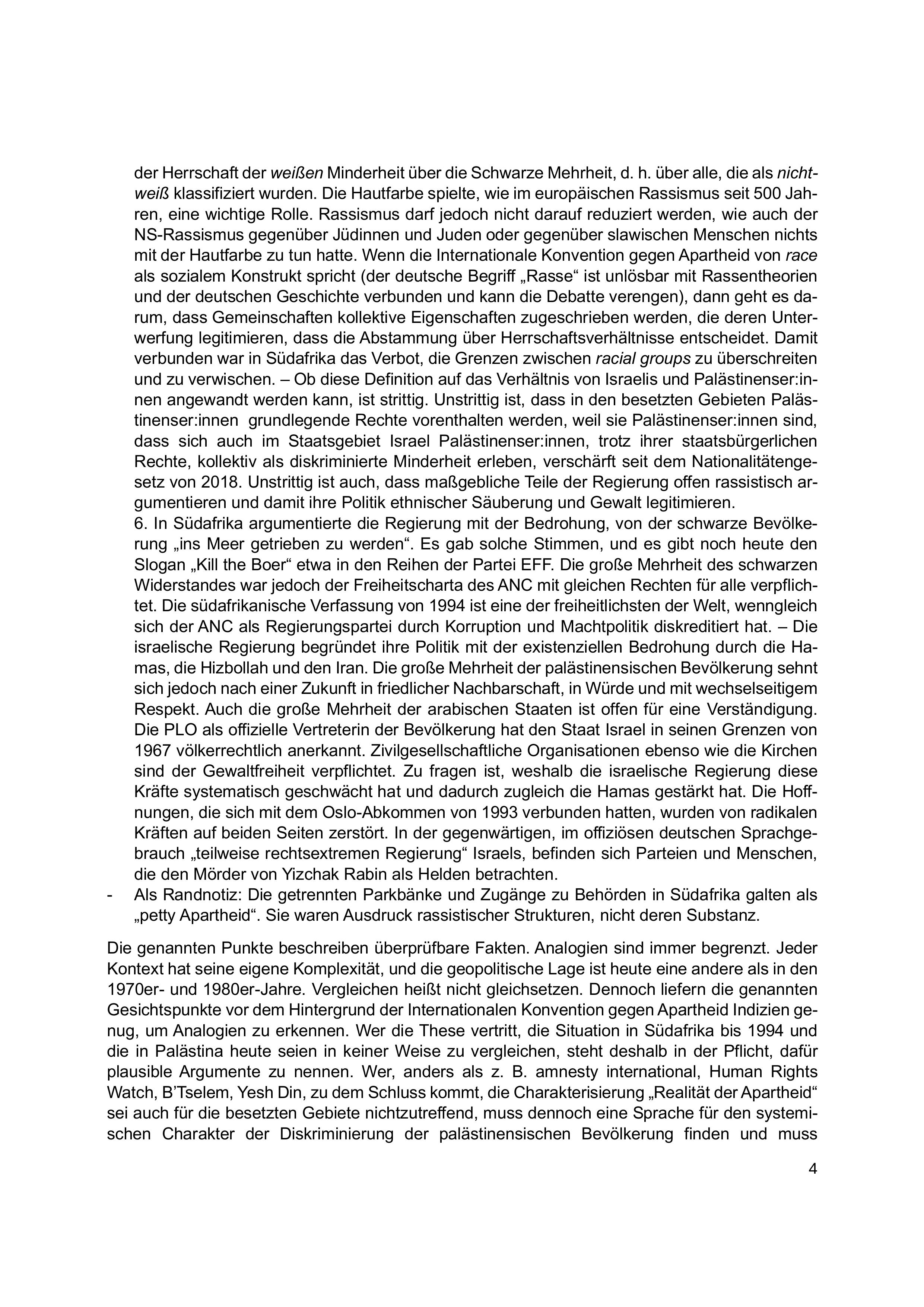 Staat Israel dieselben Regeln gelten müssen wie für alle anderen Staaten. Diese Position wird auch von vielen jüdischen Wissenschaftler:innen, Journalist:innen und Friedensaktivist:innen vetreten.