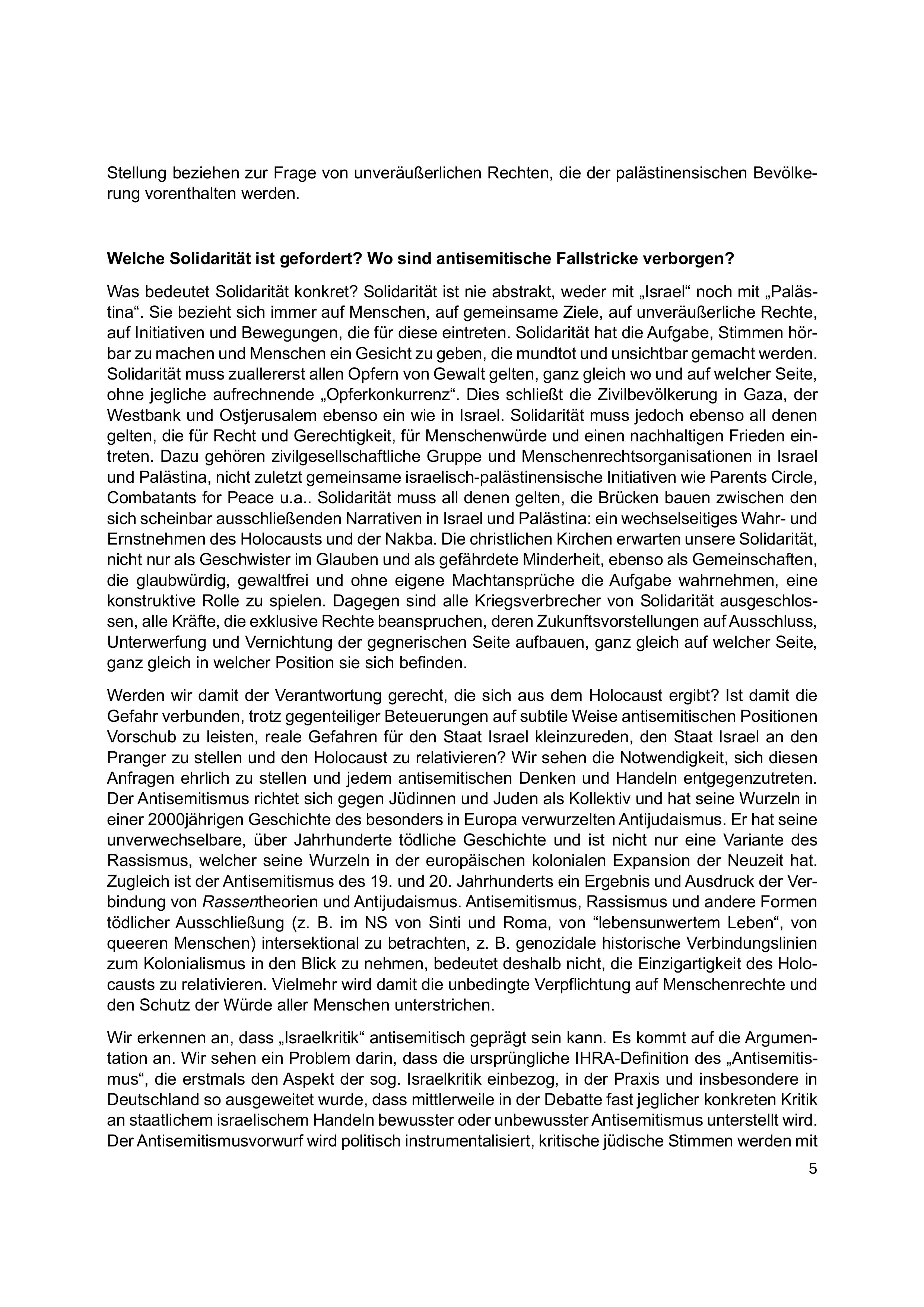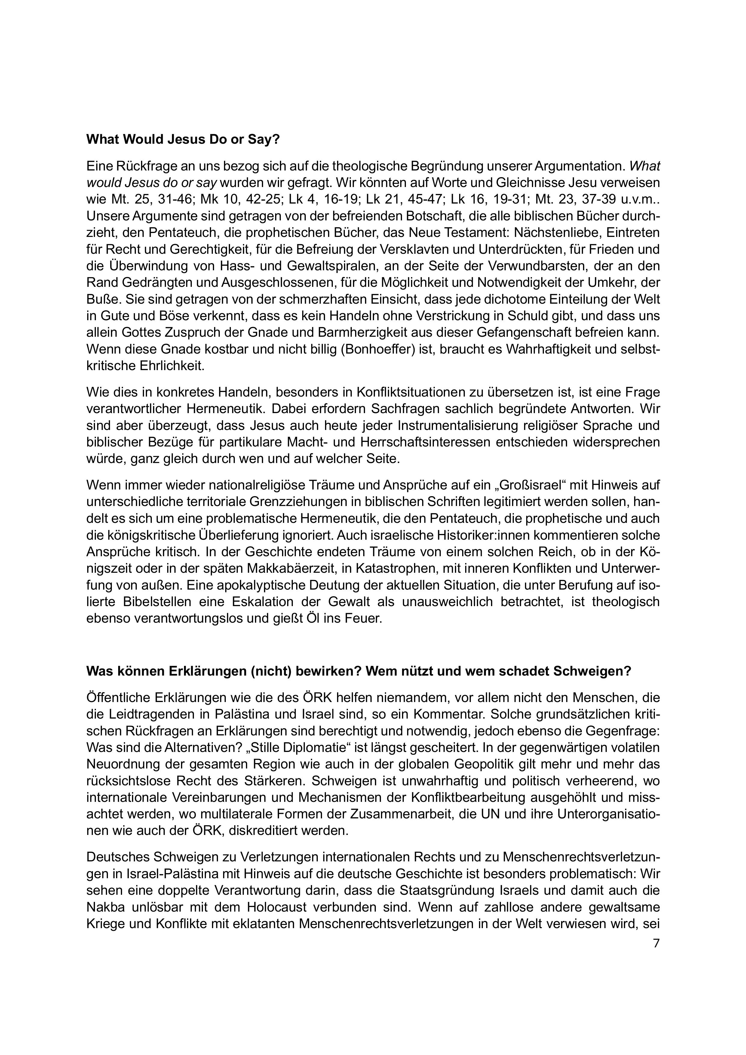 Die bedrückende, dramatische Aktualität und die Tatsache, dass deutsche Kirchen sich von der ÖRK-Erklärung distanziert und sich damit auch ökumenisch isoliert haben, veranlasst uns, uns nochmals ausführlicher zu Wort zu melden.