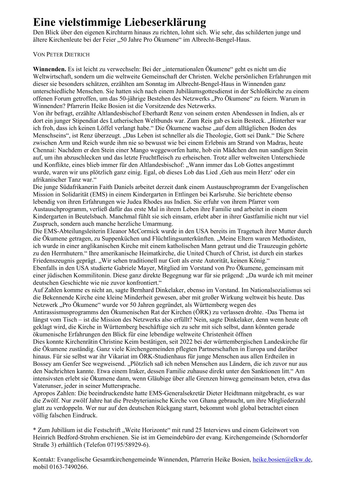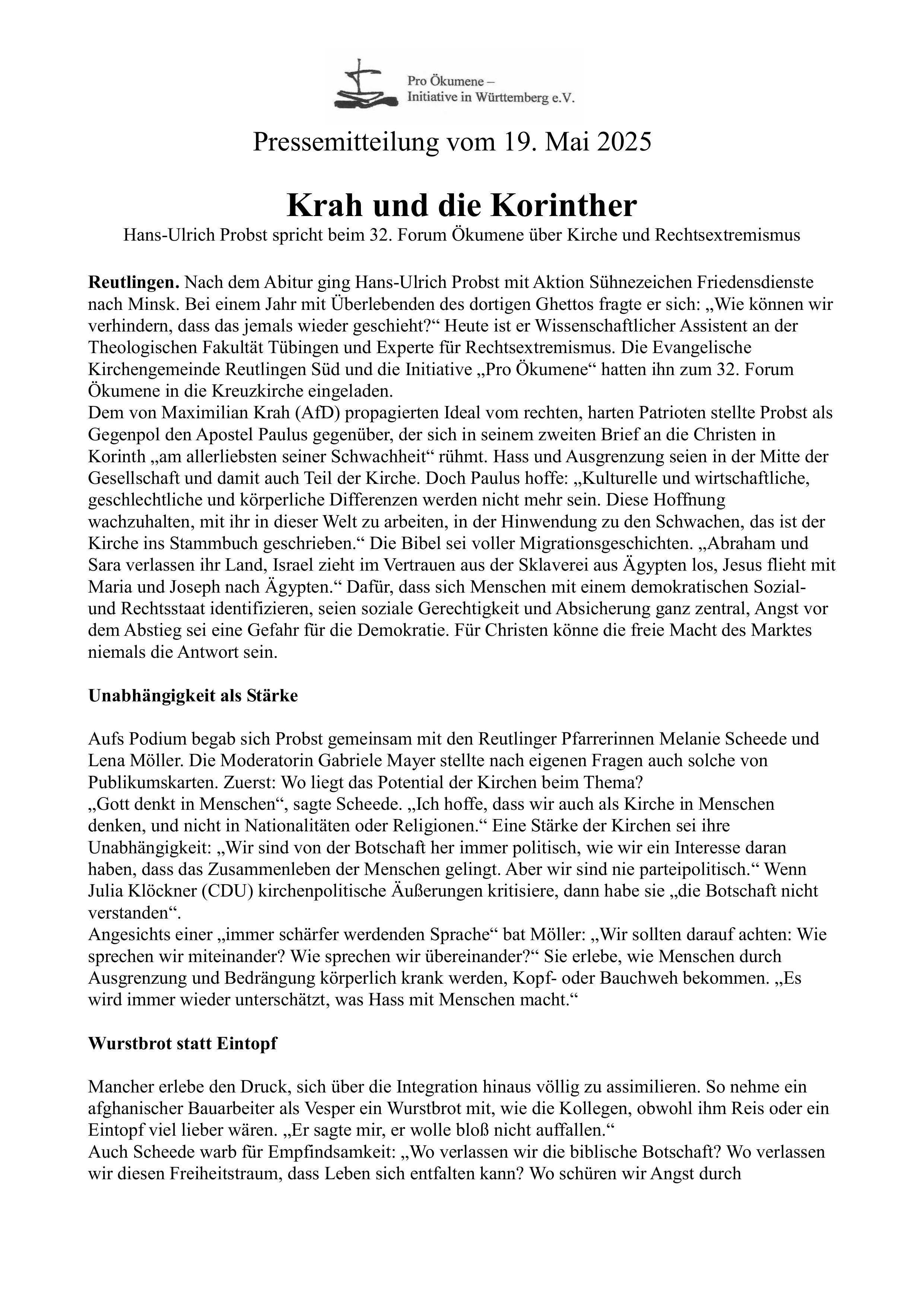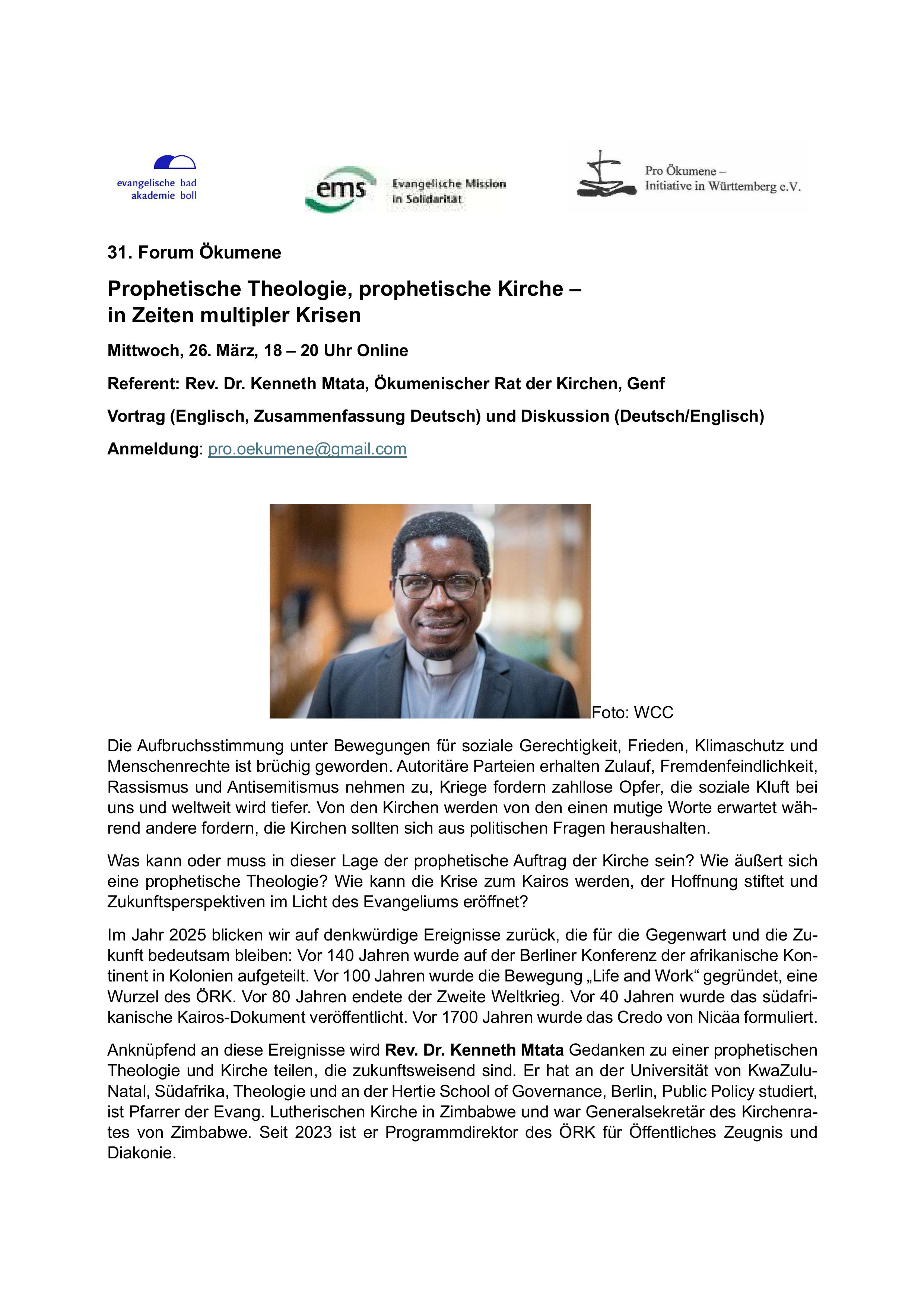 all diesen Tragödien zu Wort meldet und zum "Beten und Tun des Gerechten" aufruft. Als Pro Ökumene setzen wir uns mit unseren "Forum Ökumene"-Veranstaltungen mit einer großen Bandbreite an Themen, Herausforderungen und Kontexten auseinander.